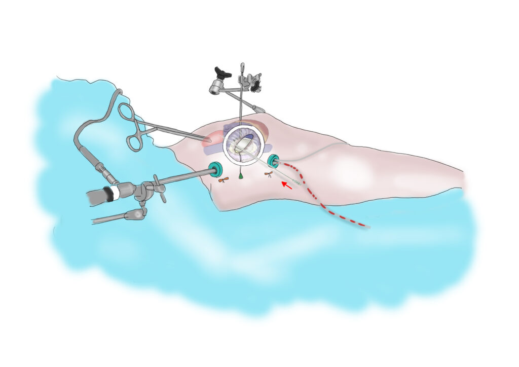 L’intervento può avvenire in visione diretta, oppure con l’ausilio di una telecamera che viene inserita da una microincisione nelle vicinanze e sorretta da un braccio meccanico articolato e fissato al tavolo operatorio. Per manipolare i tessuti e operare, il chirurgo si serve di strumenti appositi per gli accessi mininvasivi e simili a quelli che vengono utilizzati durante interventi in laparoscopici