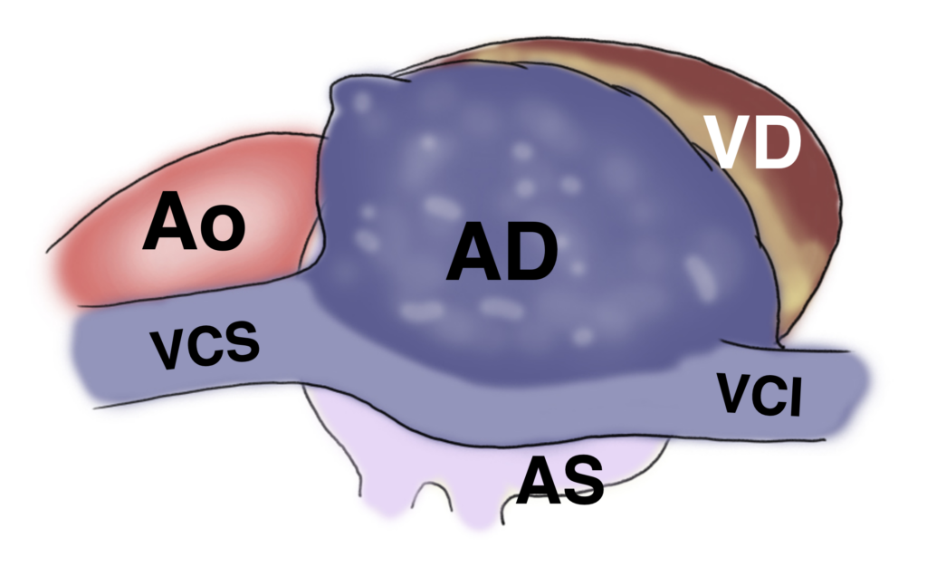Visione del cuore in toracotomia destra, con polmone destro collassato e pericardio aperto. AD: atrio destro; Ao: aorta; AS: atrio sinistro; VCS: vena cava superiore; VCI: vena cava inferiore; VD: ventricolo destro. Immagine realizzata per lezioni a specializzandi e studenti.
