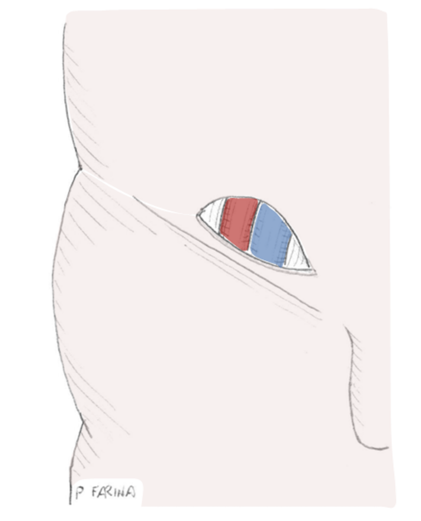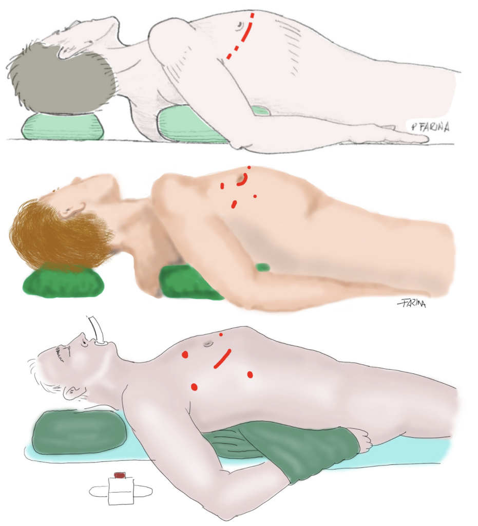 Incisioni per la chirurgia mitralica mininvasiva. Le diverse immagini riflettono, dall’alto in basso, incisioni differenti in base ai centri in cui ho lavorato. I disegni mostrano anche, in ordine cronologico, tre tecniche diverse che ho utilizzato per fare i disegni: l’immagine in alto è una scansione di un disegno a penna colorato al computer mediante la sovrapposizione di forme monocrome semitrasparenti; l’immagine al centro è realizzata al computer, con una tavoletta grafica opaca; l’immagine in basso è realizzata al computer, disegnando e colorando direttamente su un display interattivo
