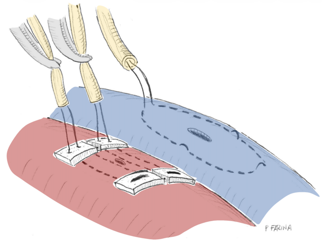 Esposizione chirurgica dei vasi femorali comuni all’inguine e confezionamento delle “borse” (suture che chiuderanno i buchi lasciati dalle cannule una volta rimosse).