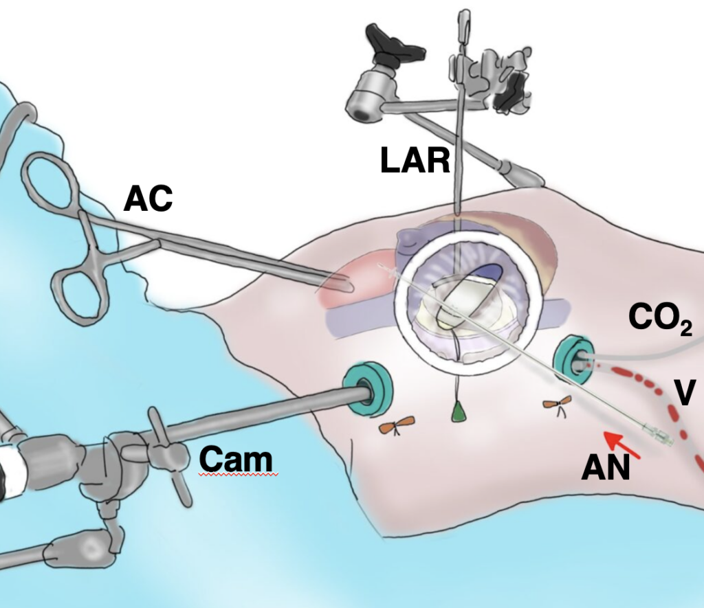 Esempio di setup per chirurgia mitralica mininvasiva. AC: clamp aortico transtoracico (clamp di Chitwood); AN: ago per la somministrazione della cardioplegia e per l’aspirazione in radice aortica; Cam: telecamera; CO2: tubicino per l’insufflazione di anidride carbonica nel torace, onde ridurre il rischio di embolia d’aria alla rimozione del clamp aortico; LAR: retrattore atriale sinistro; V: linea di aspirazione posizionata nell’atrio sinistro. Il cerchio bianco visibile intorno all’incisione è un retrattore di tessuti molli, che migliora la visione del chirurgo attraverso l’incisione.