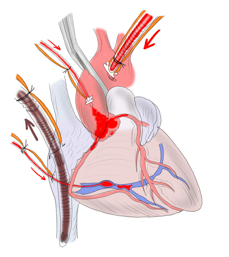 La cannula arteriosa può essere inserita in qualsiasi grossa arteria (aorta, femorale comune, ascellare o succlavia, carotide comune o tronco arterioso anonimo). Di solito, negli interventi in sternotomia viene inserita a livello dell’arco aortico prossimale (vedi figura sopra).