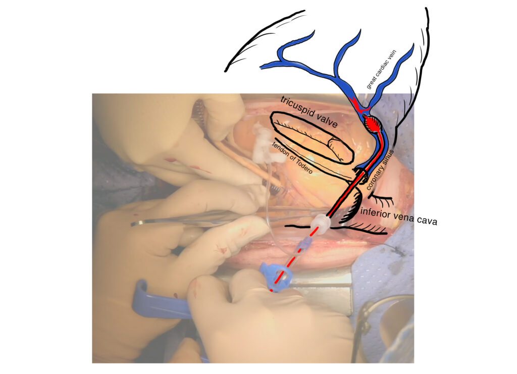 Cardioplegia retrograda: un catetere preformato viene inserito nell’atrio destro e avanzato fino a ingaggiare l’ostio del seno coronarico. La soluzione iniettata perfonderà in senso retrogrado le vene coronariche > arteriole > arterie coronarie e indurrà l’arresto cardiaco in diastole. Disegno sovrapposto a video chirurgico.
