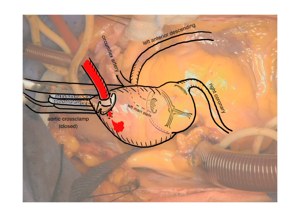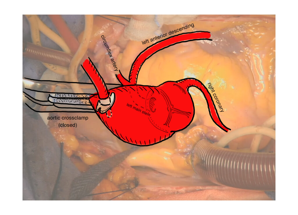 Cardioplegia anterograda indiretta: l’aorta è clampata (occlusa) e la valvola aortica è continente. La soluzione iniettata nella porzione di aorta tra la valvola e il clamp finirà nelle arterie coronarie e indurrà l’arresto cardiaco in diastole. Disegno sovrapposto a video chirurgico.