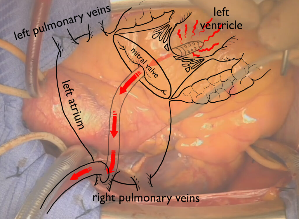 In alcuni interventi, è utile inserire una linea di drenaggio (venting) nel ventricolo sinistro. Sono possibili diverse strategie, ma la più comune consiste nell’inserire la cannula nella vena polmonare superiore di destra ed avanzarla attraverso la valvola mitralica fino a raggiungere il ventricolo sinistro.
