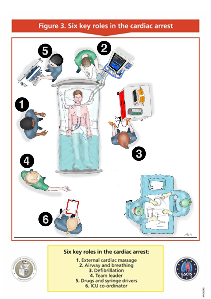 Il protocollo CSU-ALS (Cardiac Surgical Unit – Advanced Life Support) prevede che un arresto cardiaco in un paziente cardiochirurgico sia gestito idealmente da un team di sei persone, ognuna con un ruolo ben stabilito (vedi immagine sopra) e con in mente l’obiettivo – qualora le altre manovre falliscano – di ottenere la riapertura del torace entro 5 minuti dall’inizio dell’arresto (tempo oltre il quale possono insorgere danni cerebrali irreversibili).